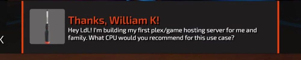Thanks, William K! Hey LdL! I'm building my first plex/game hosting server for me and family. What CPU would you recommend for this use case?