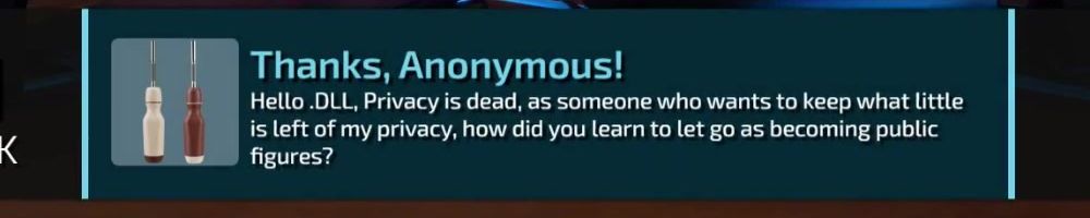 Thanks, Anonymous! Hello .DLL, Privacy is dead, as someone who wants to keep what little is left of my privacy, how did you learn to let go as becoming public figures?