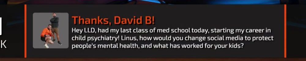 Thanks, David B! Hey LLD, had my last class of med school today, starting my career in child psychiatry! Linus, how would you change social media to protect people's mental health, and what has worked for your kids?