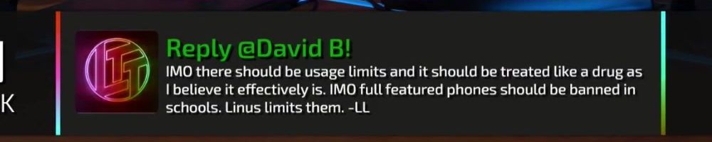 Reply @David B! IMO there should be usage limits and it should be treated like a drug as I believe it effectively is. IMO full featured phones should be banned in schools. Linus limits them. -LL