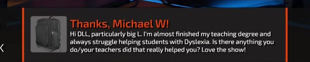Thanks, Michael W! Hi DLL, particularly big L. I'm almost finished my teaching degree and always struggle helping students with Dyslexia. Is there anything you do/your teachers did that really helped you? Love the show!
