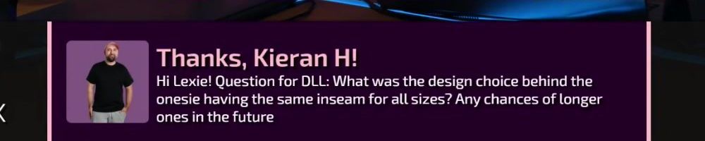 Thanks, Kieran H! Hi Lexie! Question for DLL: What was the design choice behind the onesie having the same inseam for all sizes? Any chances of longer ones in the future