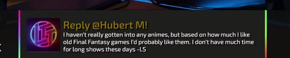 Reply @Hubert M! I haven't really gotten into any animes, but based on how much I like old Final Fantasy games I'd probably like them. I don't have much time for long shows these days -LS
