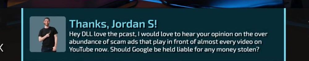 Thanks, Jordan S! Hey DLL love the pcast, I would love to hear your opinion on the over abundance of scam ads that play in front of almost every video on YouTube now. Should Google be held liable for any money stolen?