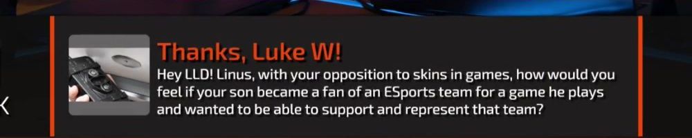 Thanks, Luke W! Hey LLD! Linus, with your opposition to skins in games, how would you feel if your son became a fan of an ESports team for a game he plays and wanted to be able to support and represent that team?