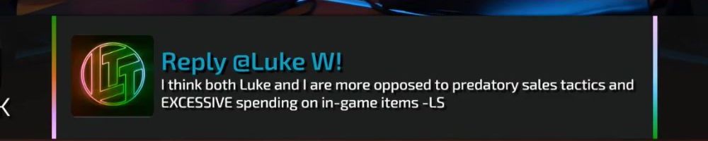 Reply @Luke W! I think both Luke and I are more opposed to predatory sales tactics and EXCESSIVE spending on in-game items -LS