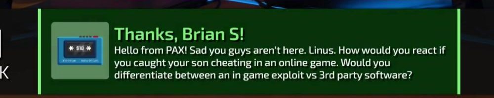 Thanks, Brian S! Hello from PAX! Sad you guys aren't here. Linus. How would you react if you caught your son cheating in an online game. Would you differentiate between an in game exploit vs 3rd party software?