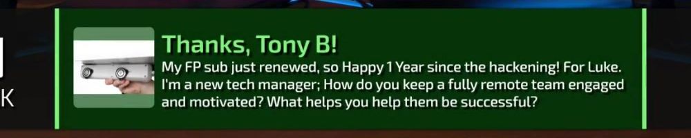 Thanks, Tony B! My FP sub just renewed, so Happy 1 Year since the hackening! For Luke. I'm a new tech manager; How do you keep a fully remote team engaged and motivated? What helps you help them be successful?