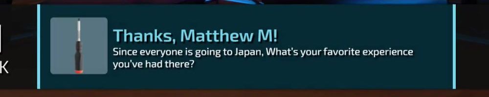 Thanks, Matthew M! Since everyone is going to Japan, What's your favorite experience you've had there?