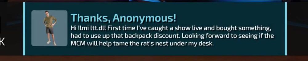 Thanks, Anonymous! Hi !tmi ltt.dll First time I've caught a show live and bought something, had to use up that backpack discount. Looking forward to seeing if the MCM will help tame the rat's nest under my desk.
