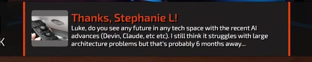 Thanks, Stephanie L! Luke, do you see any future in any tech space with the recent AI advances (Devin, Claude, etc etc). I still think it struggles with large architecture problems but that's probably 6 months away...