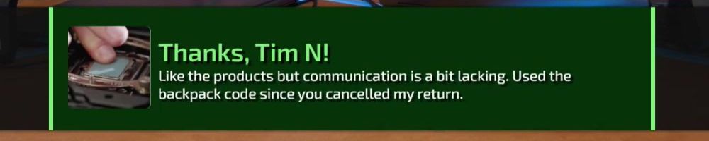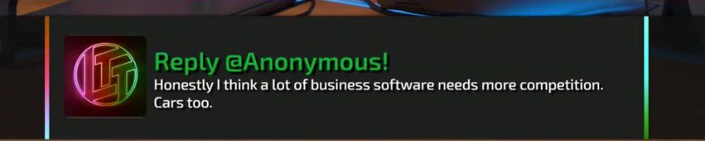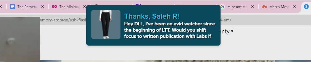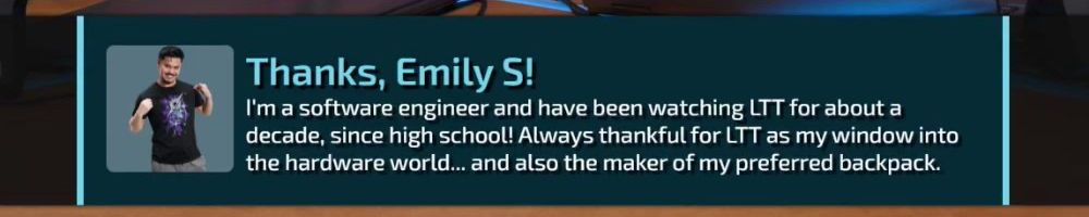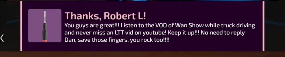 Thanks, Robert L! You guys are great!!! Listen to the VOD of Wan Show while truck driving and never miss an LTT vid on youtube! Keep it up!!! No need to reply Dan, save those fingers, you rock too!!!