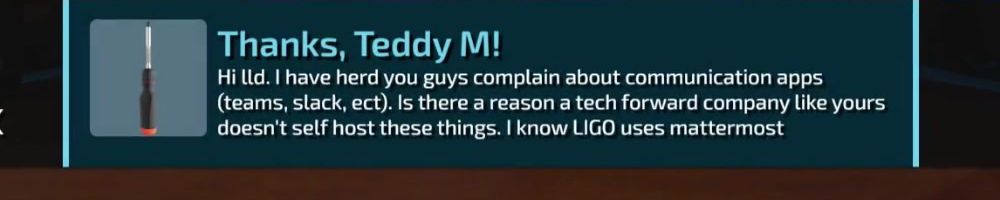 Thanks, Teddy M! Hi ld. I have herd you guys complain about communication apps (teams, slack, ect). Is there a reason a tech forward company like yours doesn't self host these things. I know LIGO uses mattermost