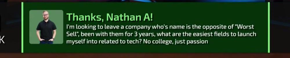 Thanks, Nathan A! I'm looking to leave a company who's name is the opposite of "Worst Sell", been with them for 3 years, what are the easiest fields to launch myself into related to tech? No college, just passion