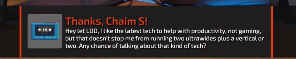Thanks, Chaim S! Hey let LDD, I like the latest tech to help with productivity, not gaming, but that doesn't stop me from running two ultrawides plus a vertical or two. Any chance of talking about that kind of tech?