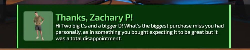 Thanks, Zachary P! Hi Two big L's and a bigger D! What's the biggest purchase miss you had personally, as in something you bought expecting it to be great but it was a total disappointment.