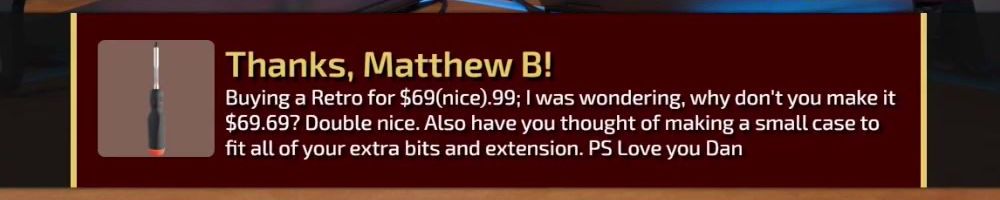 Thanks, Matthew B! Buying a Retro for $69(nice).99; I was wondering, why don't you make it $69.69? Double nice. Also have you thought of making a small case to fit all of your extra bits and extension. PS Love you Dan