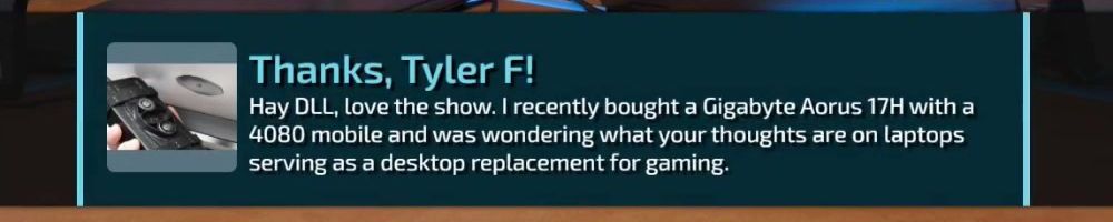 Thanks, Tyler F! Hay DLL, love the show. I recently bought a Gigabyte Aorus 17H with a 4080 mobile and was wondering what your thoughts are on laptops serving as a desktop replacement for gaming.