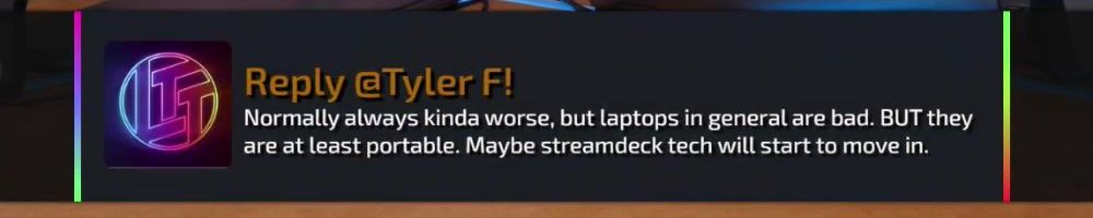 Reply @Tyler F! Normally always kinda worse, but laptops in general are bad. BUT they are at least portable. Maybe streamdeck tech will start to move in.