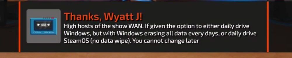 Thanks, Wyatt J! High hosts of the show WAN. If given the option to either daily drive Windows, but with Windows erasing all data every days, or daily drive SteamOS (no data wipe). You cannot change later