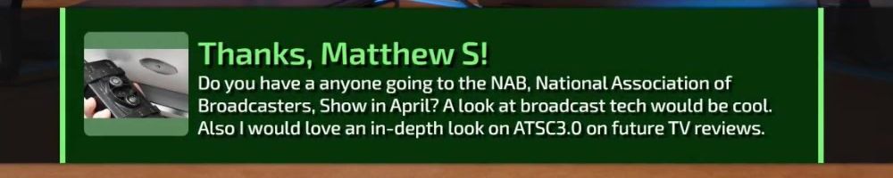 Thanks, Matthew S! Do you have a anyone going to the NAB, National Association of Broadcasters, Show in April? A look at broadcast tech would be cool. Also I would love an in-depth look on ATSC3.0 on future TV reviews.