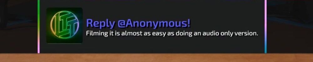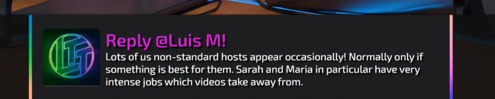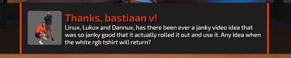 Thanks, bastiaan v! Linux, Lukux and Dannux, has there been ever a janky video idea that was so janky good that it actually rolled it out and use it. Any idea when the white rgb tshirt will return?