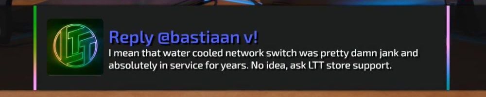 Reply @bastiaan v! I mean that water cooled network switch was pretty damn jank and absolutely in service for years. No idea, ask LTT store support.