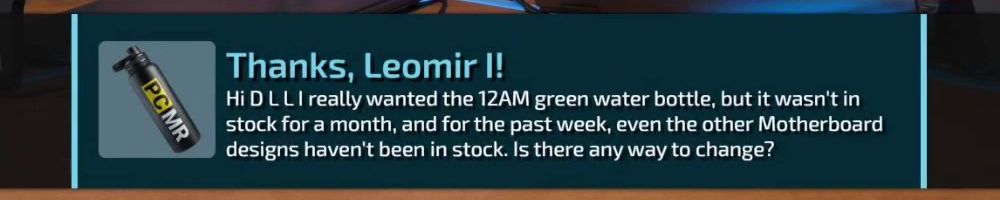 Thanks, Leomir I! Hi D L LI really wanted the 12AM green water bottle, but it wasn't in stock for a month, and for the past week, even the other Motherboard designs haven't been in stock. Is there any way to change?