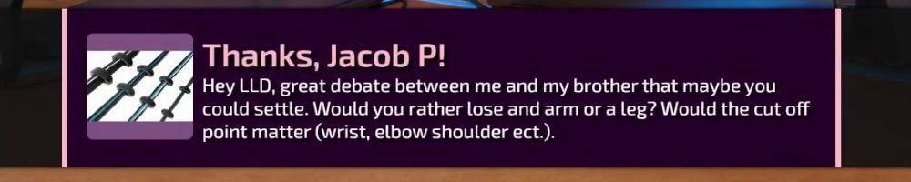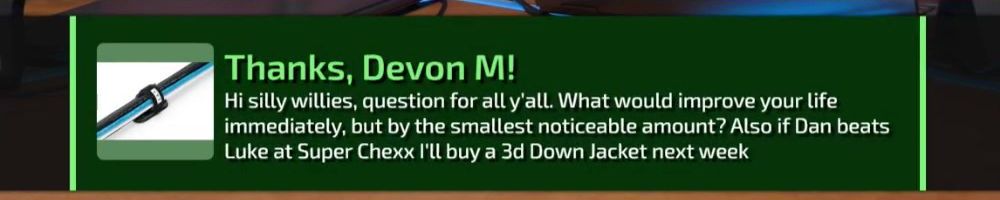 Thanks, Devon M! Hi silly willies, question for all y'all. What would improve your life immediately, but by the smallest noticeable amount? Also if Dan beats Luke at Super Chexx I'll buy a 3d Down Jacket next week