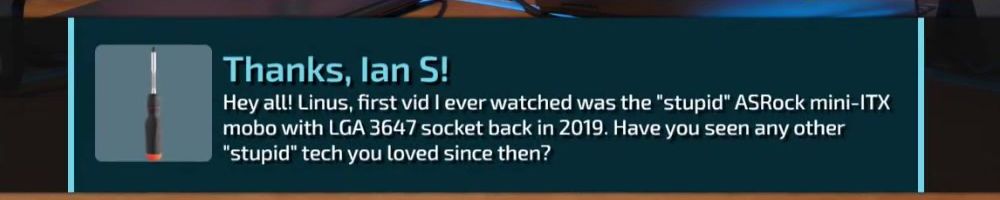 Thanks, Ian S! Hey all! Linus, first vid I ever watched was the "stupid" ASRock mini-ITX mobo with LGA 3647 socket back in 2019. Have you seen any other "stupid" tech you loved since then?