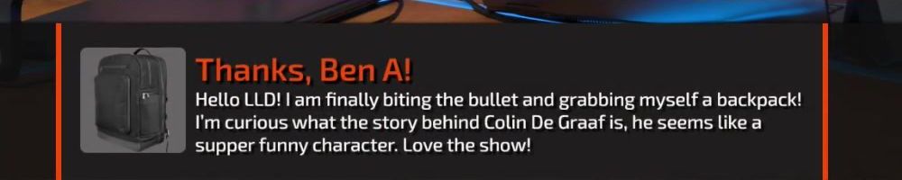 Thanks, Ben A! Hello LLD! I am finally biting the bullet and grabbing myself a backpack! I'm curious what the story behind Colin De Graaf is, he seems like a supper funny character. Love the show!