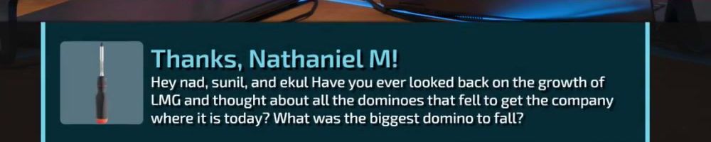 Thanks, Nathaniel M! Hey nad, sunil, and ekul Have you ever looked back on the growth of LMG and thought about all the dominoes that fell to get the company where it is today? What was the biggest domino to fall?