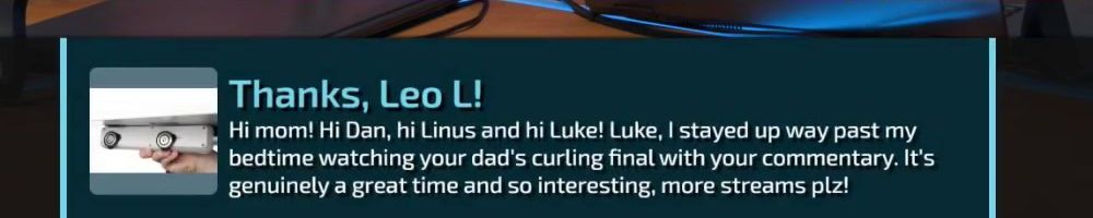 Thanks, Leo L! Hi mom! Hi Dan, hi Linus and hi Luke! Luke, I stayed up way past my bedtime watching your dad's curling final with your commentary. It's genuinely a great time and so interesting, more streams plz!
