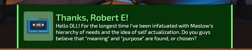 Thanks, Robert E! Hello DLL! For the longest time I've been infatuated with Maslow's hierarchy of needs and the idea of self actualization. Do you guys believe that "meaning" and "purpose" are found, or chosen?