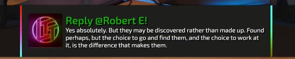 Reply @Robert E! Yes absolutely. But they may be discovered rather than made up. Found perhaps, but the choice to go and find them, and the choice to work at it, is the difference that makes them.