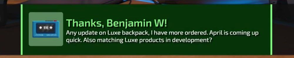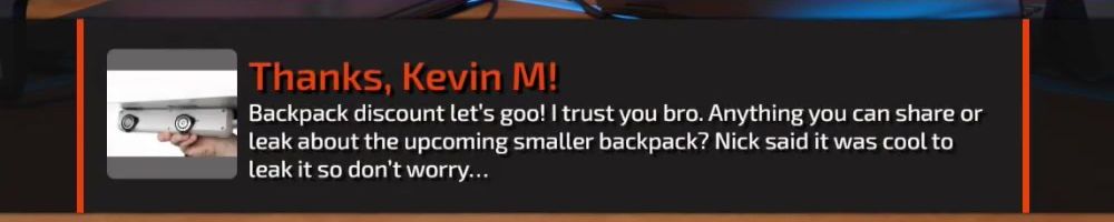 Thanks, Kevin M! Backpack discount let's goo! I trust you bro. Anything you can share or leak about the upcoming smaller backpack? Nick said it was cool to leak it so don't worry...