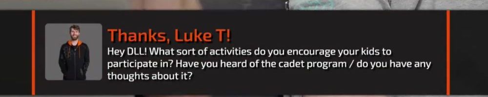 Thanks, Luke T! Hey DLL! What sort of activities do you encourage your kids to participate in? Have you heard of the cadet program / do you have any thoughts about it?