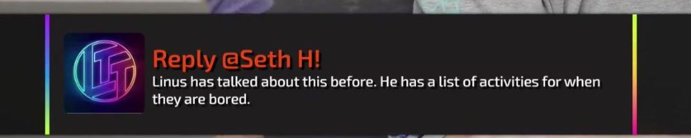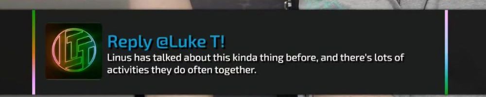 Reply @Luke T! Linus has talked about this kinda thing before, and there's lots of activities they do often together.