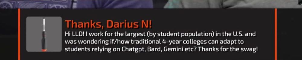 Thanks, Darius N! Hi LLD! I work for the largest (by student population) in the U.S. and was wondering if/how traditional 4-year colleges can adapt to students relying on Chatgpt, Bard, Gemini etc? Thanks for the swag!