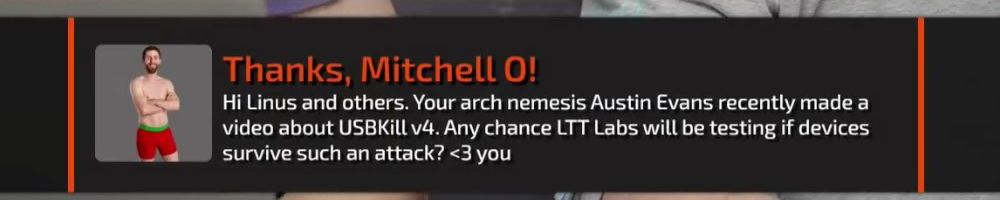 Thanks, Mitchell O! Hi Linus and others. Your arch nemesis Austin Evans recently made a video about USBKill v4. Any chance LTT Labs will be testing if devices survive such an attack? <3 you