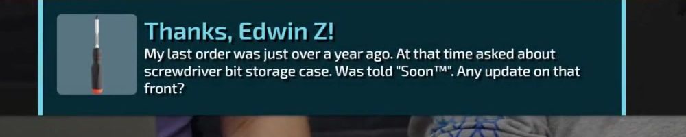Thanks, Edwin Z! My last order was just over a year ago. At that time asked about screwdriver bit storage case. Was told "Soon™". Any update on that front?
