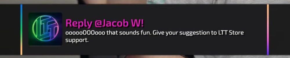 Reply @Jacob W! 0000000000 that sounds fun. Give your suggestion to LTT Store support.
