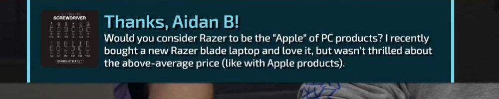 Thanks, Aidan B! Would you consider Razer to be the "Apple" of PC products? I recently bought a new Razer blade laptop and love it, but wasn't thrilled about the above-average price (like with Apple products).
