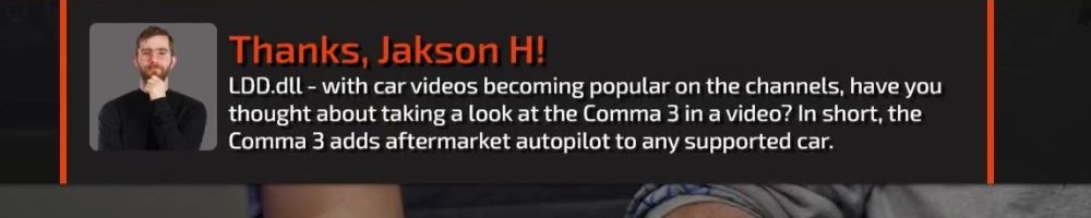 Thanks, Jakson H! LDD.dll - with car videos becoming popular on the channels, have you thought about taking a look at the Comma 3 in a video? In short, the Comma 3 adds aftermarket autopilot to any supported car.