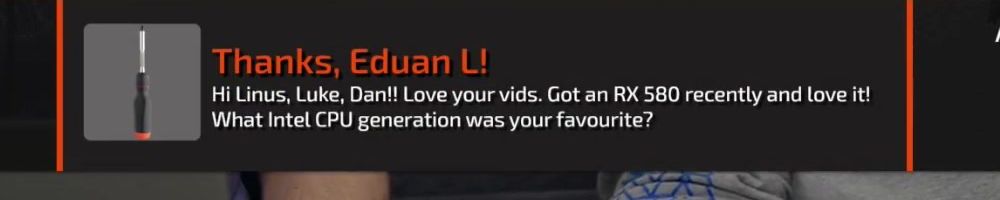 Thanks, Eduan L! Hi Linus, Luke, Dan!! Love your vids. Got an RX 580 recently and love it! What Intel CPU generation was your favourite?