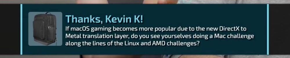 Thanks, Kevin K! If macOS gaming becomes more popular due to the new DirectX to Metal translation layer, do you see yourselves doing a Mac challenge along the lines of the Linux and AMD challenges?