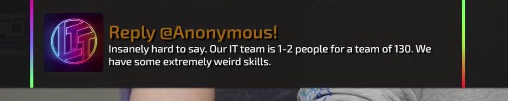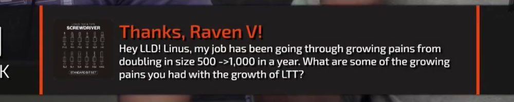 Thanks, Raven V! Hey LLD! Linus, my job has been going through growing pains from doubling in size 500 ->1,000 in a year. What are some of the growing pains you had with the growth of LTT?