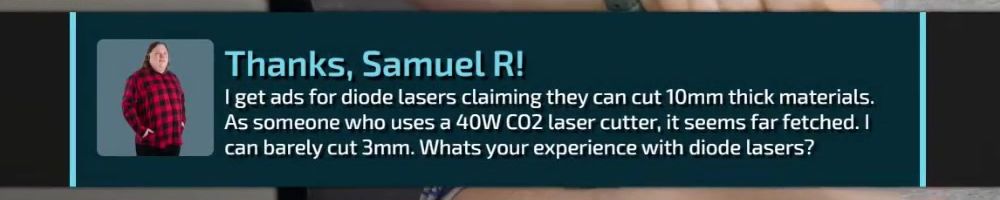Thanks, Samuel R! I get ads for diode lasers claiming they can cut 10mm thick materials. As someone who uses a 40W CO2 laser cutter, it seems far fetched. I can barely cut 3mm. Whats your experience with diode lasers?