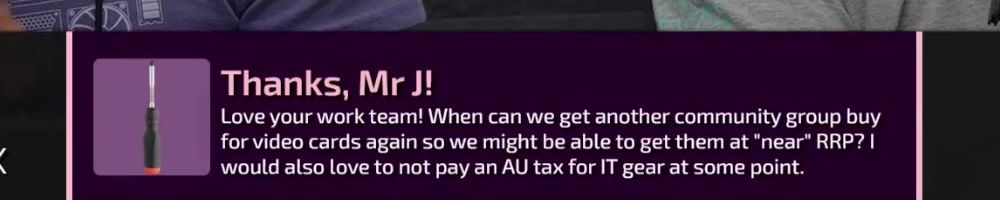 Thanks, Mr J! Love your work team! When can we get another community group buy for video cards again so we might be able to get them at "near" RRP? I would also love to not pay an AU tax for IT gear at some point.