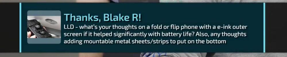 Thanks, Blake R! LLD - what's your thoughts on a fold or flip phone with a e-ink outer screen if it helped significantly with battery life? Also, any thoughts adding mountable metal sheets/strips to put on the bottom